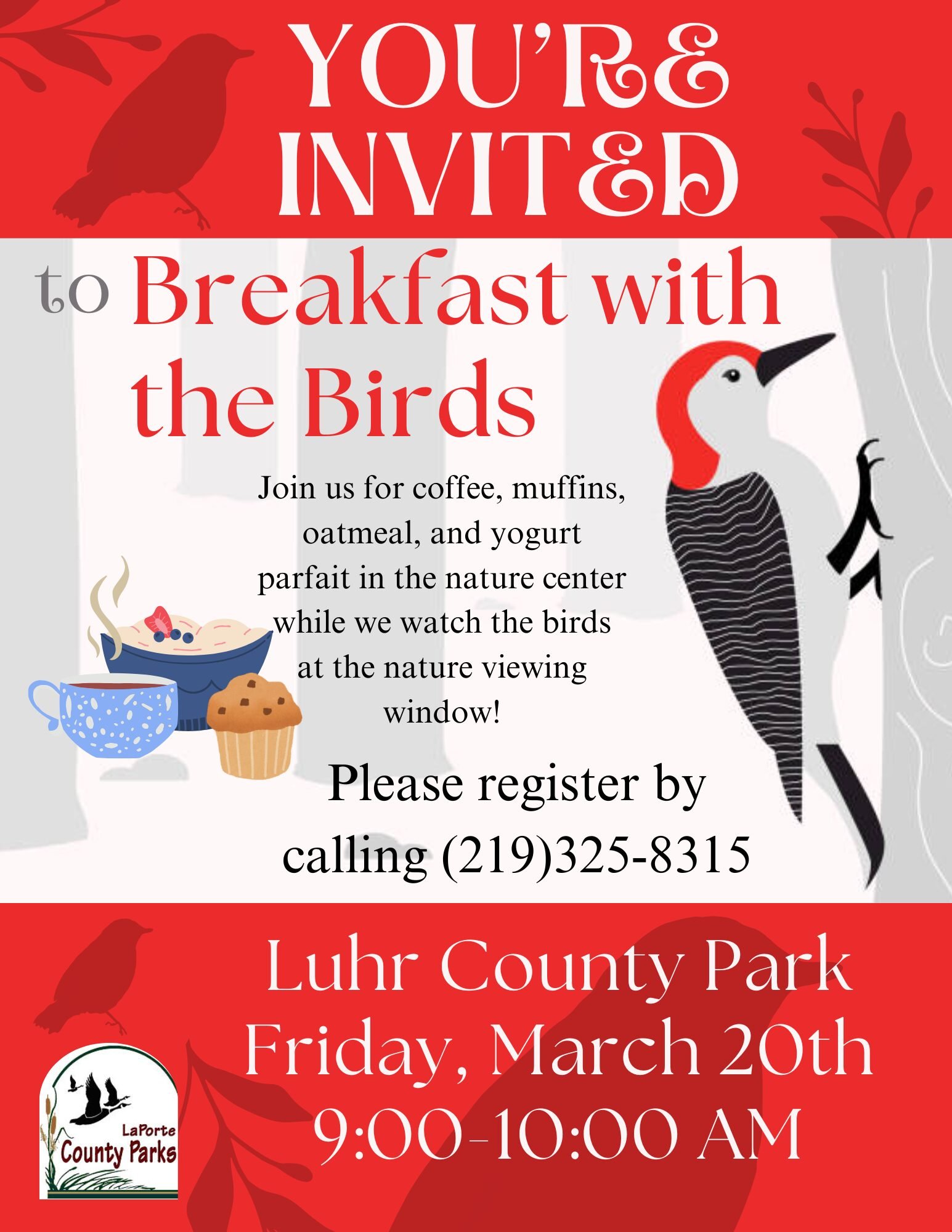 Enjoy some coffee, muffins, oatmeal, and a yogurt parfait at the nature center while we watch the birds at the nature viewing window.