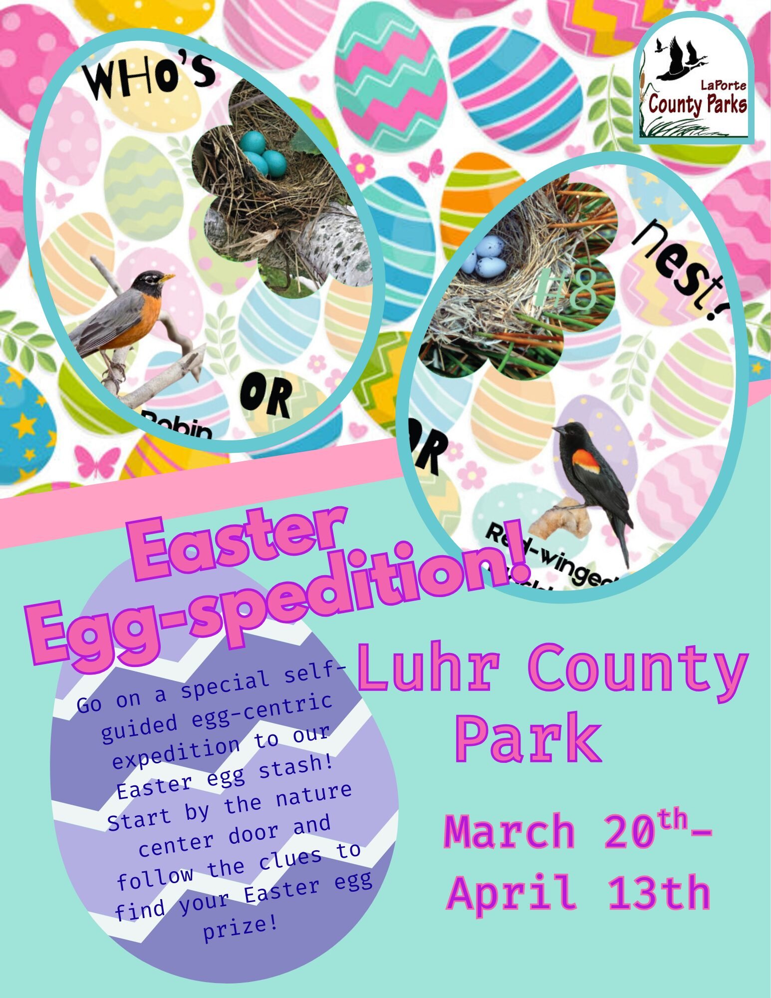 Go on a special self-guided egg-centric expedition to our Easter egg stash! Start by the nature center door and follow the clues to find your Easter egg prize!