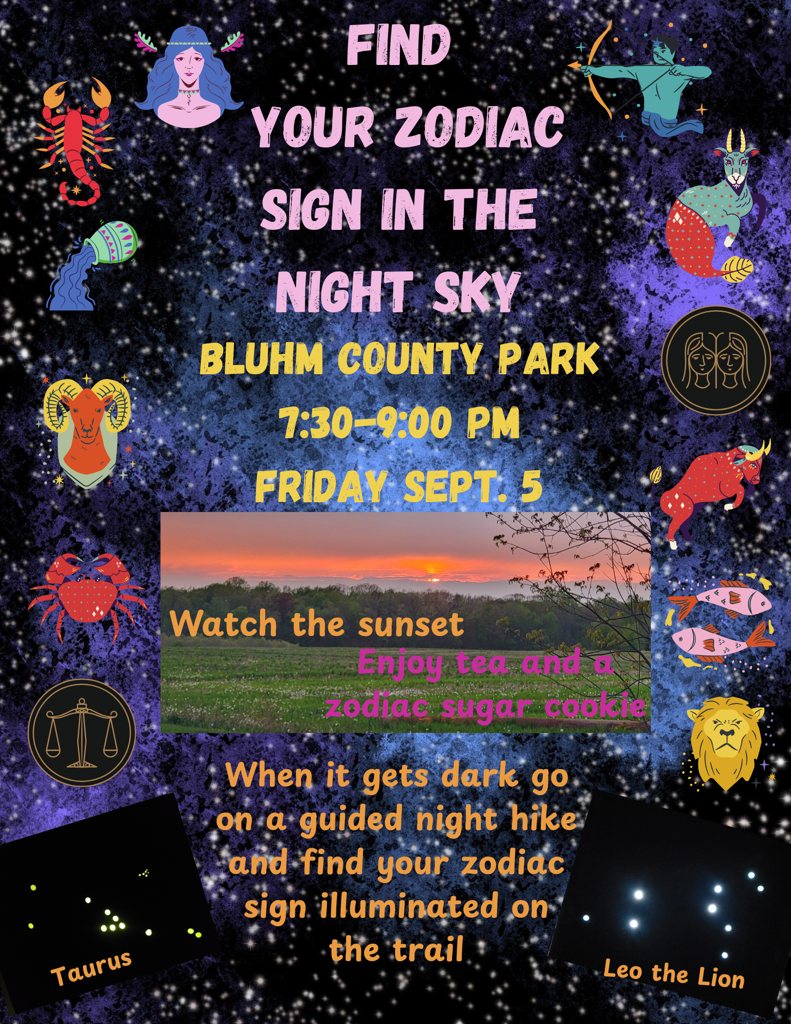 Learn all about your zodiac sign, look for your sign in the sky, and find it illuminated on the path, then enjoy some cookies and a cozy cup of tea (regular, decaf, or herbal).