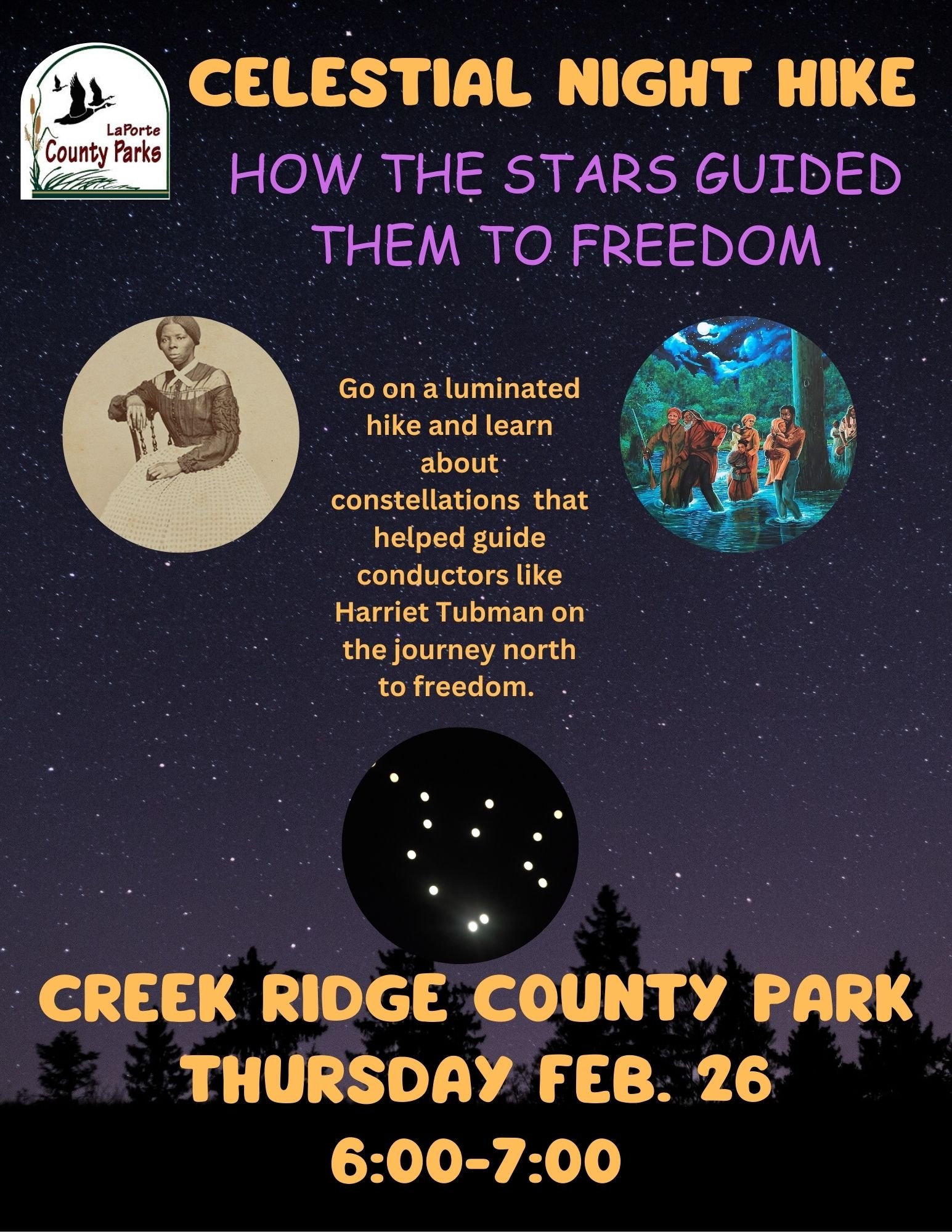 Go on a luminated hike through the woods to learn about constellations that helped guide conductors like Harriet Tubman on the journey north to freedom.
